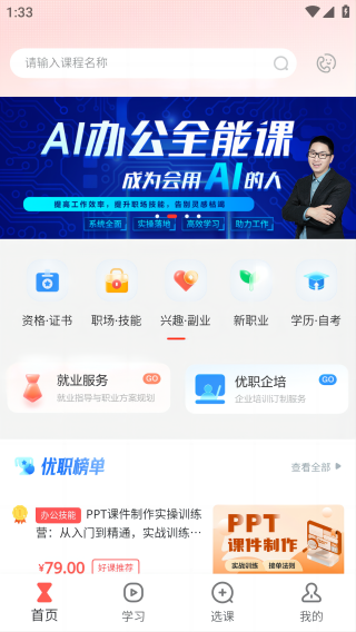 优职app有建工消防、财会管理、医药健康、IT互联网四大类职业资格培训,可以提升用户自身的竞争力和价值。除此之外,还有职场软技能、新职业、副业兼职三大类职业技能培训服务,让用户有更多发展空间,不局限于当前职业,实现自我增值。