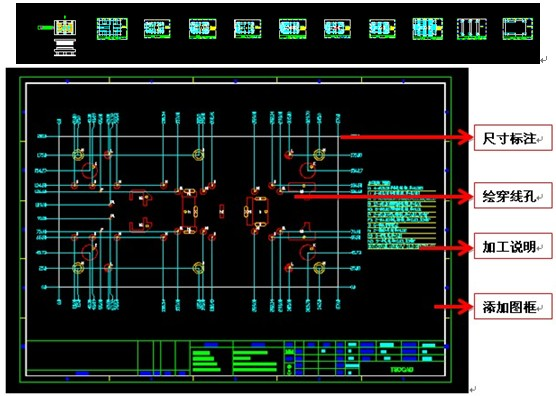 模具总装图绘制完成后,可自动拆分出模板图,绘制穿孔、列出加工说明、标注模板尺寸、以及自动套图框。