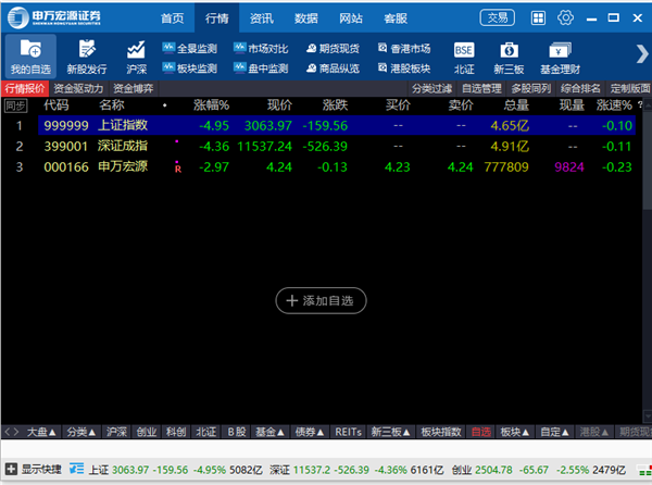 1、我的自选,申万宏源证券显示自选股列表,通过功能键“添加、删除”进行自选股设置;可将自选股上下移动,可根据行情字段对自选股进行排序。