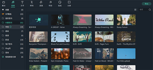音频库有50多首首歌曲,音乐类型涵盖:年轻,柔和,摇滚,民谣,电子音乐等等,还有很多丰富的音效。