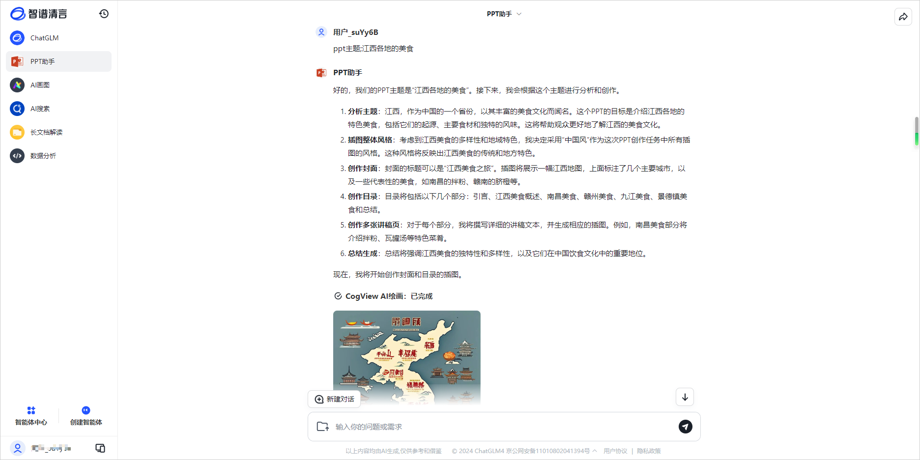 2、输入你想要生成的ppt主题,智谱清言会为你生成一个大纲以及配图和讲稿