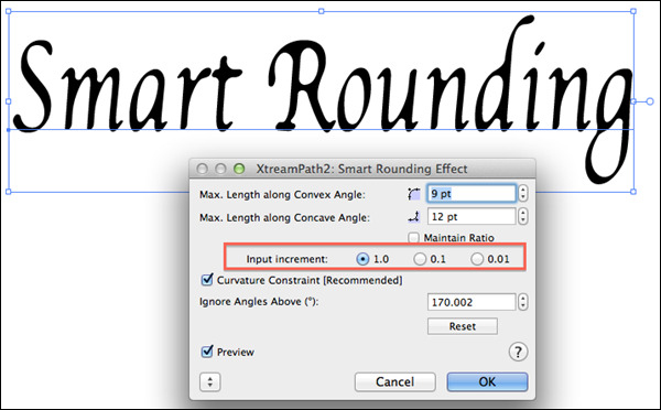 Smart Rounding可以单独设置凸角和凹角,也可以设置最大长度。(有“沿凹面角度的最大长度”和“沿凸角的最大长度”的设置。)此外,即使有大量文本,它也可以在眨眼间作为批处理进行处理。智能舍入是圆润文本角落的最佳工具。