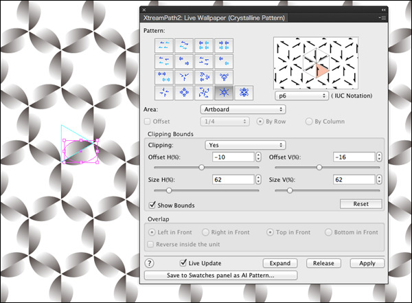 动态壁纸用指定区域填充所选艺术作品的副本。Xtream Path 2面板根据国际晶体学联合会(IUC)标准提供17种不同的壁纸图案。壁纸中的单位可以转移到Illustrator的“图案编辑模式”并保存在“样本”面板中。