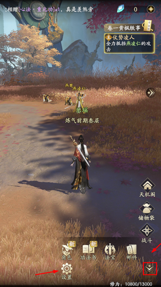 1、打开凡人修仙传人界篇,进入游戏后,点击右下角箭头,然后点击设置;