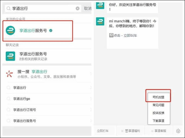2、进入服务号后,点击有下角的“享道客服”,选择“司机加盟”选项,进入加盟界面后,上面有对应的要求,满足条件的,点击页面下方的“加入享道”;