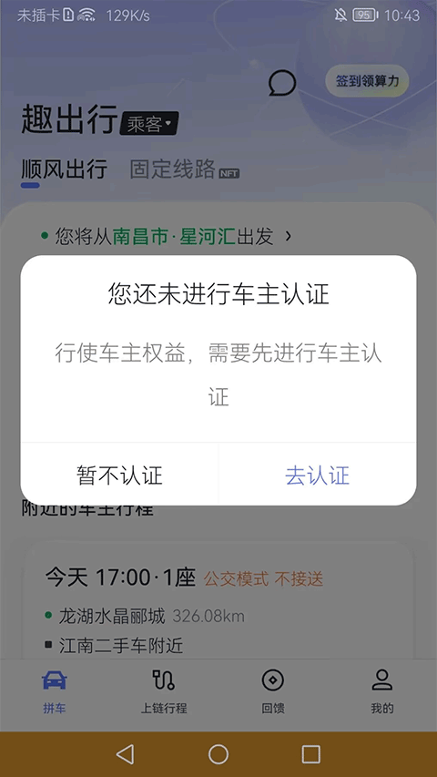 5、如果你是司机,在拼车页面点击“乘客”,需要进行车主认证。