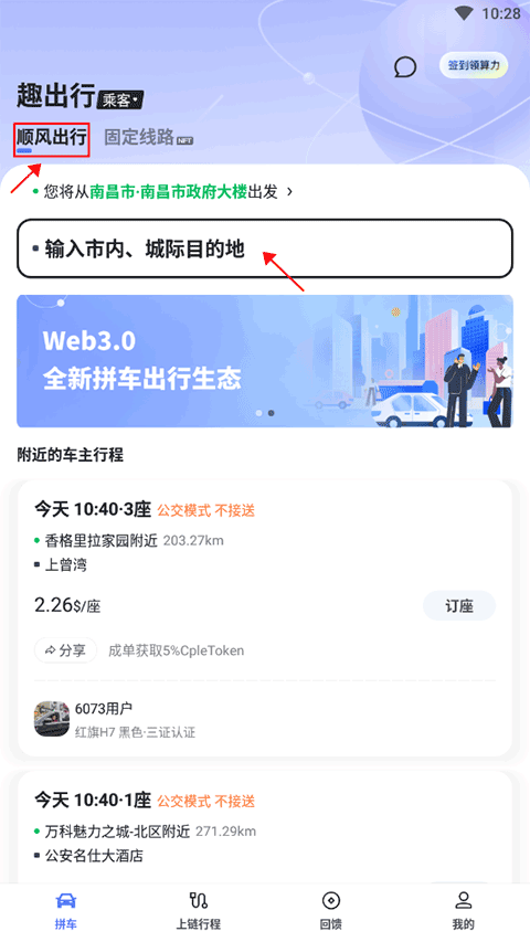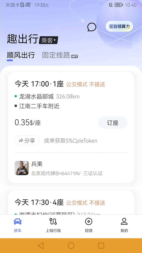 2、趣出行app与社交功能强化,除了上下班拼车的场景之外,也适用于跨城拼车、临时拼车等多个拼车场景。