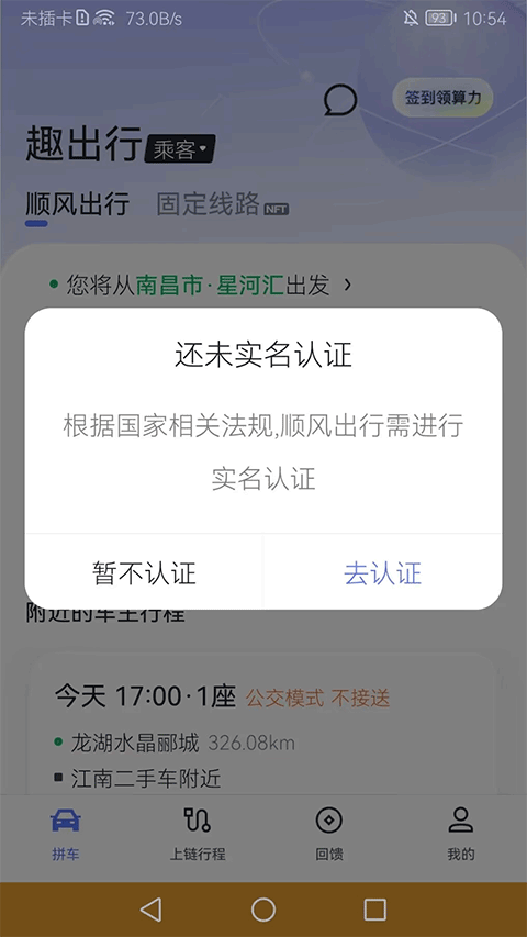 3、第一次使用会需要进行实名认证,输入身份信息,完成面部识别即可成功获取顺风车信息。