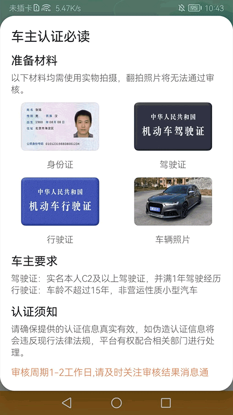 6、上传所需证件信息即可认证成功,就可以开始自行发起乘车信息,等待乘客订座了。