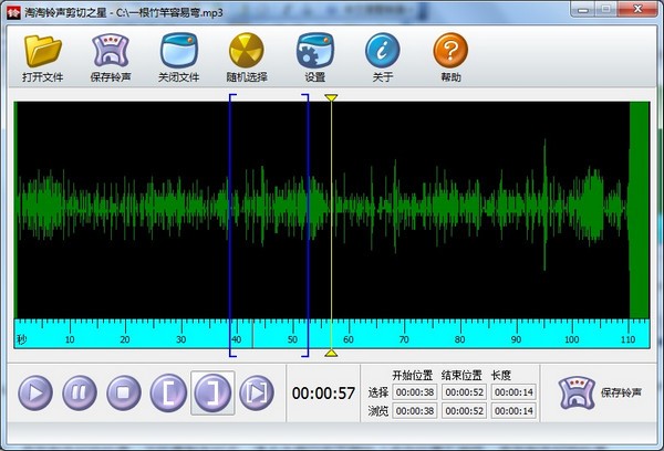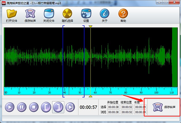 5、软件操作非常方便,只需要把你想要剪切的铃声的开始位置和结尾设定好,点击保存就可以了。