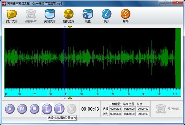 3、选择铃声起始位置。仔细倾听音乐文件的播放过程,当播放到铃声的起始位置时,点击窗口左下部工具条中的“选择铃声起始位置”按钮,