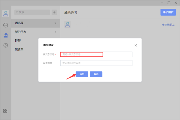 3、输入好友手机号,发送好友申请即可