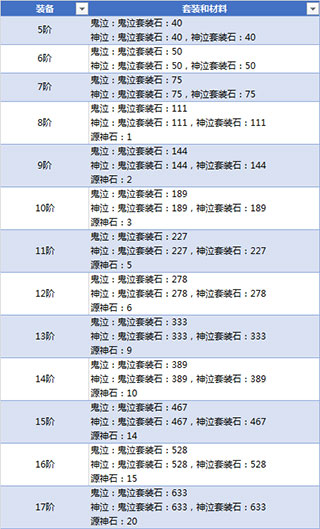 套装的制作需要消耗套装石,根据装备的不同部位分为不同的套装石。而不同等阶的装备所需的对应的套装石材料也不一样哦,例如六阶装备制作套装需要50个套装石,而七阶需要75个、九阶需要144个,十阶需要189个,十一阶需要227个。