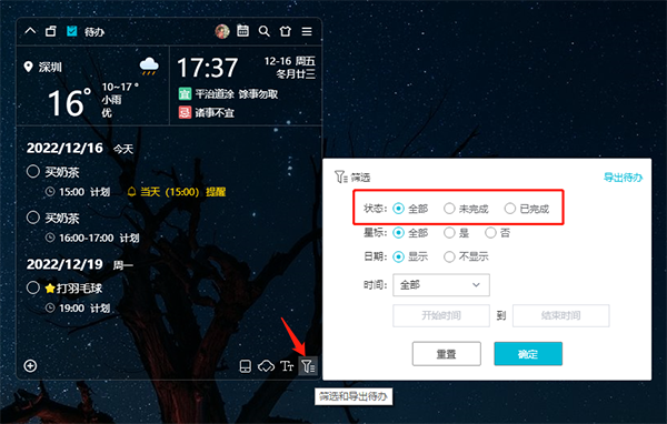 ●待办筛选:如果日常创建了太多待办,而又想快速找到指定时间或状态下的待办,可以直接开启筛选。点击待办界面右下角的“筛选和导出”图标,再设置筛选条件后就可以帮你快速找到想要的待办啦。
