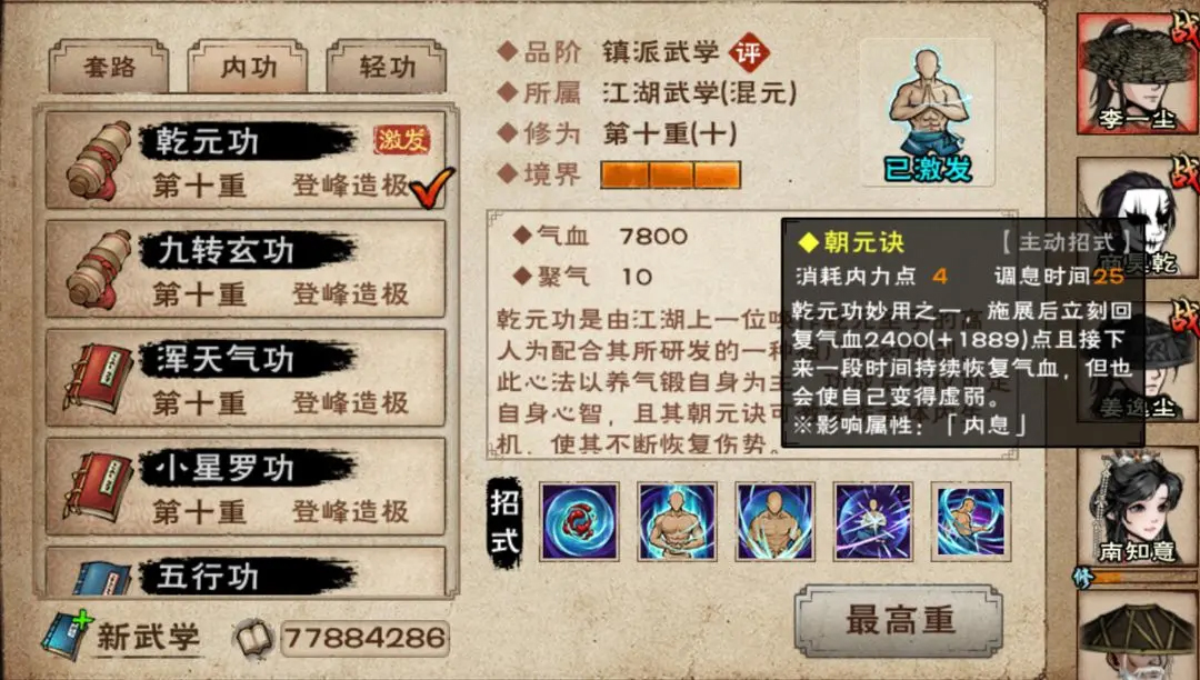 治疗类内功中的治疗技能通常都是受到内息加成的,如下图中内功乾元功的主动招式朝元诀括号中1889便是内息加成而来的