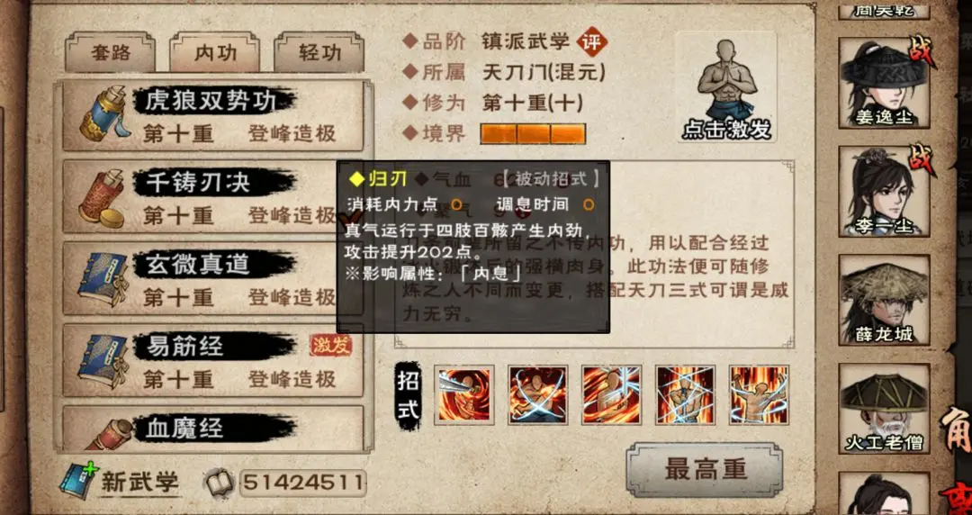 内息同样也能够对我们武学中的技能进行加成,如下图中的归刃技能,受到内息加成后额外增加了202点攻击
