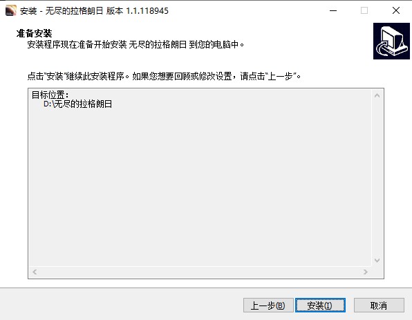 点击“安装”继续此安装程度,如果您想要回顾或修改设置,请点击“上一步”。
