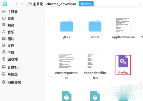 1、解压完成后,win+e键,打开深度文件管理器,找到firefox的解压目录。这里为~/chrome_downloads下。