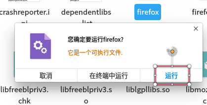 2、然后运行目录下的firefox,出现提示,单击“运行”。